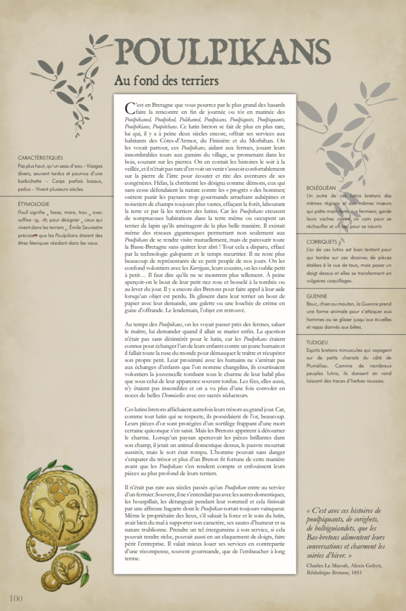 Qui connaît encore les Ameraudes, Chorts, Bergleutes et Arragousets ? Qui a entendu parler des Alux, Derricks, Goraches et Létiches ? Qui se souvient de tous ces esprits féeriques perdus dans les ombres et qui attendent la personne qui saura à nouveau murmurer leur nom afin qu’ils s’éveillent à nos consciences ? Ces Esprits de la Nature, Génies du Lieu, Gardiens de nos foyers et de nos forêts sombrent peu à peu dans l’oubli. Ce livre vous dévoile leurs noms, leurs mœurs, leurs activités. Il est rempli de leurs farces et de leurs cris. Au travers de lectures, de voyages et de rencontres, ces esprits se sont révélés, ont soufflé leurs noms, ont laissé entrevoir leurs traces. Les voici livrés à votre curiosité, pour que vous les portiez à votre tour à la connaissance du monde, pour qu’au moins ceux-là demeurent vivants. Place aux lutins grimaçants, aux elfes sautillants, aux fées bienveillantes et aux indispensables gnomes. Partez à la découverte fabuleuse de ces Esprits Oubliés qui se dissimulent au cœur de la Nature et de la Maison. Le troisième tome d’une trilogie magique et indispensable !